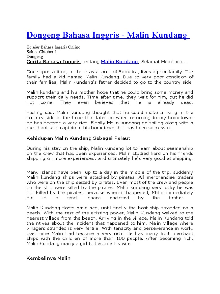 Materi makalah cerita rakyat, cerita rakyat malin kundang, lutung kasarung, legenda panjang, pengertian, jenis, ciri, unsur dan contohnya kemudian, malin kundang pergi ke tanah rantau meninggalkan sang ibu seorang diri. Sang ayah pergi melaut itulah ringkasan cerita tentang malin kundang yang dapat. Tak disangka kapal mereka bersandar ke pantai di mana dulu malin kundang tinggal. The boy was called malin kundang. Pada zaman dahulu disuatu kampung nelayan di daerah padang, sumatra barat.