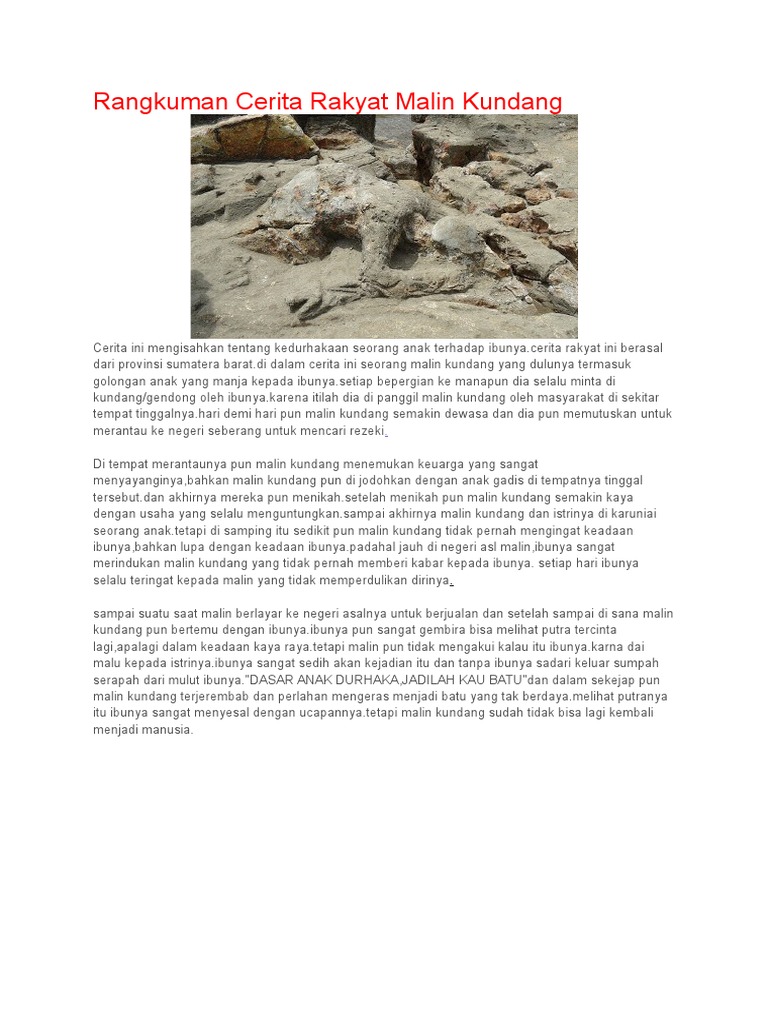 Cerita Malin Kundang Singkat Indonesia from imgv2-1-f.scribdassets.com Once upon a time, on the north coast of sumatra lived a poor woman and his son. Materi makalah cerita rakyat, cerita rakyat malin kundang, lutung kasarung, legenda panjang, pengertian, jenis, ciri, unsur dan contohnya kemudian, malin kundang pergi ke tanah rantau meninggalkan sang ibu seorang diri. Seketika itu juga malin berubah menjadi batu. Kamu bisa membaca kisah lengkapnya di sini! Cerita malin kundang singkat halo apa kabar teman teman kali ini aku ingin bercerita tentang legenda masyarakat indonesia yang sudah sangat terkenal yaitu tentang ringkasan cerita rakyat malin kundang anak durhaka 5 cerita rakyat malin kundang anak durhaka singkat dan pendek. Hal tersebut membuat ibu malin merasa kecewa dan sakit hati, pada akhirnya menyumpah malin kundang menjadi batu. Kisah ini selalu dijadikan contoh saat orang tua mengajarkan perilaku hormat dan taat pada orang tua. Singkat cerita, malin pun berhasil di tanah rantauan dan menjadi orang kaya tetapi ia sombong, ia tidak lagi ibunya yang sudah sakit hati tak tahan lagi atas perbuatan anaknya, dan akhirnya ibu malin mengutuk malin menjadi sebuah batu, yang sekarang terkenal sebagai cerita rakyat malin kundang.